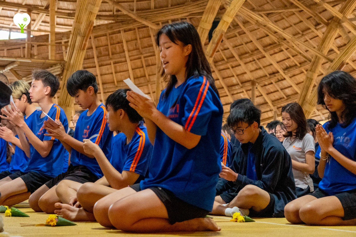 This year’s ceremony took place in Panyaden’s bamboo-vaulted assembly hall, a fitting setting for an event rooted in mindfulness, tradition, and respect. Students were already seated, waiting quietly as teachers arrived. Each teacher was welcomed with a flower garland before taking their place on the stage, while traditional Thai music performed by students created a calm and reflective atmosphere. The ceremony began with Buddhist chanting and bowing to the Triple Gem, grounding the event in the school’s spiritual and cultural foundations.